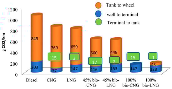 Life cycle greenhouse gas comparison of diesel and LNG heavy-duty vehicle (adapted from []). Note: Permission granted from the publisher (Elsevier-Renewable and Sustainable Energy Reviews).