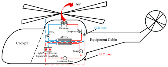 Some military helicopters have a large number of high-power airborne electronic equipment that generates a great amount of heat. Both an air cooling system (ACS) and liquid cooling system (LCS) can be used for the cooling of electronic equipment in helicopters. For avionics with low heat flux, the ACS can be used. However, for avionics with high heat flux, there may be many problems when the ACS is adopted. First, the ACS will inevitably bleed an amount of air from the engine, which in turn will result in excessive fuel penalty. Second, excessive air flow cannot be provided by some engines. In addition, it is difficult to arrange the air-cooling pipeline in the electronic equipment cabin due to limited space. Therefore, a new type of helicopter thermal management system should be used to cool the avionics instead of ECS [4].