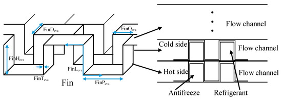 The structure of the studied compact plate fin ARHEx is shown in Figure 2. It is composed of fins and flow channels. The flow channels of antifreeze and refrigerant are arranged alternately. FinPeva, FinLeva, FinTeva, FinHeva, and FinOeva represent the fin parameters. In the present study, FinPeva = 1 mm, FinLeva = 1 mm, FinTeva = 0.1 mm, FinHeva = 1.5 mm, and FinOeva = 0.5 mm. The height of the flow channel is 1.5 mm. The length, height, and width of the condenser are 270 mm, 160 mm, and 80 mm, respectively. The heat transfer coefficient of ARHEx is increased by arranging the channels to be multi-channel countercurrent. The number of antifreeze and refrigerant channels is 21 and 20, respectively.