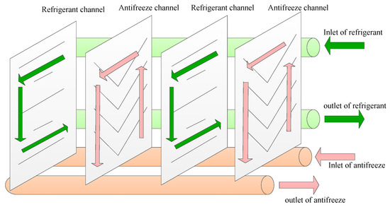 Figure 3 shows the principle of ARHEx. The antifreeze flows into the cylindrical cavity, then flows into the 21 channels, and finally flows out of the ARHEx, while the refrigerant flows into the other 20 channels. The antifreeze and refrigerant exchange heat in the form of cross-flow.