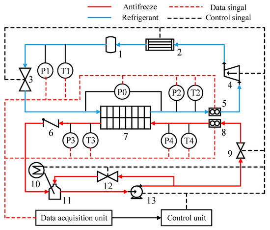 Schematic of the experimental facility [8], (1: condenser dryer; 2: water-cooled plate fin condenser; 3: electronic expansion valve (EEV); 4: compressor; 5: mass flow meter; 6: non-return valve; 7: ARHEx; 8: volume flow meter; 9: control valve; 10: electronic heating device; 11: antifreeze tank; 12: bypass valve; 13: antifreeze pump).