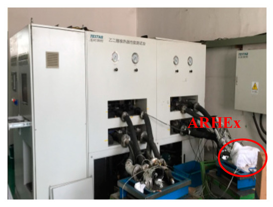 As shown in Figure 4, the fluid in the VCR loop was R134a, while the fluid in the ALC loop was 65% glycol aqueous solution. In the VCR loop, R134a flowed successively through the ARHEx, mass flow meter, compressor, water-cooled plate fin condenser, condenser dryer, and the EEV. When the vapor compressed by the compressor flowed through the condenser, the heat was dissipated into the ram air, and then the vapor flowed through the EEV with a two-phase state. Finally, the two-phase refrigerant absorbed the heat in the ARHEx, flowed back to the compressor, and achieved a cycle. In the ALC loop, antifreeze flowed successively through the antifreeze tank, antifreeze pump, control valve, ARHEx, and non-return valve. An electric heater was used in our experiment to simulate the heating of electronic avionics.