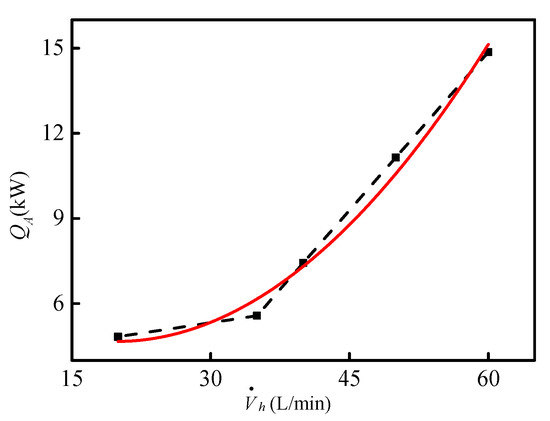 Figure 6 shows the relationship of QA and for the given conditions, where QA is calculated with Equation (4). In Figure 6, the dotted line is the experimental data, and the solid line is the fitting curve. With the increase in volume flow rate, the heat transfer quantity obviously increases. When the volume flow reaches 60 L/min, the heat transfer quantity is 15 kW.