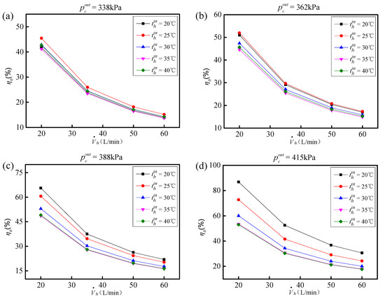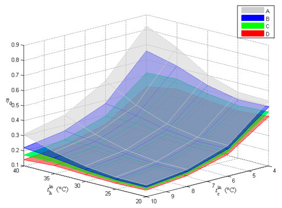 In the experiment, a constant inlet enthalpy, , and a constant outlet superheat, SH, were kept for the cold side refrigerant. The inlet volume flow, , and the temperature of the hot side antifreeze, , were changed. The calculation relationship of η0 = f () could be obtained. More than 80 experiments were carried out to obtain this relationship. In these ground experiments, ≈ 271.52 kJ/kg, SH ≈ 5 °C, and was controlled at 20, 35, 50, and 60 L/min, respectively. and were varied, respectively. Figure 7a–d shows the relationship of η0 and for the given values of and .