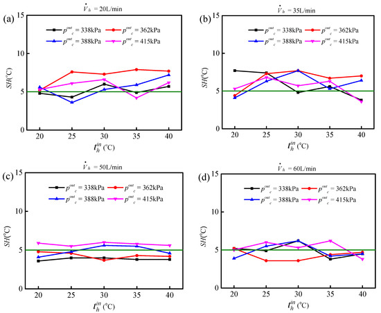 In this experiment, the SH was about 5 °C. However, there was always the deviation of in the actual experiment, which made the SH distribute around 5 °C. Figure 10a–d shows the SH during the actual experimental process.