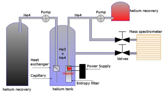 The entropy filter should work in a low temperature region, below lambda transition (2.18 K), where the osmotic-like pressure generated by the heater is an efficient driving force. Multiple measurements of the He3 concentration before and behind the filter using a mass spectrometer allow for the determination of the efficiency of the filter itself. A more detailed description can be found in our previous work [21,22]. Our experimental system consists of a 25 L He3/He4 tank, with a capillary heat exchanger [23], two pumps needed for filtration and temperature reduction and a mass spectrometer. The system prepared in this way was subjected to a cooling process.
