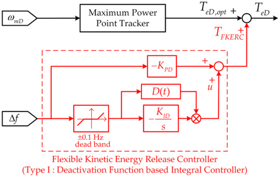In the first flexible kinetic energy release controller, an integral controller is added to the conventional droop controller when the system frequency is lower than 59.9 Hz. A deactivation function is proposed to gradually decrease the integral controller output to zero and force the DFIG to return to its steady-state maximum power point tracking (MPPT) operating mode when the system frequency eventually returns to its nominal value of 60 Hz.