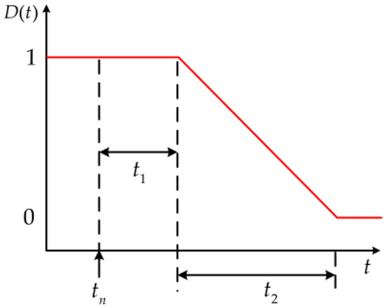 Since the integral controller output will not be zero after the transient period is over, the DFIG may work at an operating point which is different from that before the disturbance. For the DFIG to return to its MPPT mode operation when the system frequency approaches its nominal value, the integral controller output must be gradually decreased to zero. In the present work, a deactivation function D(t), as depicted in Figure 4, is proposed to gradually decrease the integral control output to zero in a very smooth manner.
