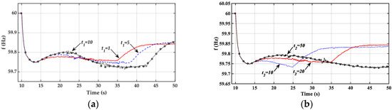 Figure 5. Effects of different delay times (t1) and decay times (t2) on system frequency. (a) Different delay, Table 1. (b) Different decay times (t2).