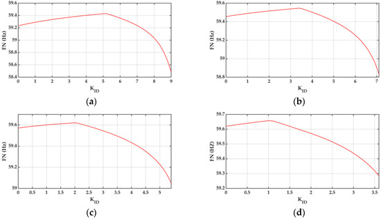 Figure 6. Effect of integral controller gain KID on frequency nadir under different values of KPD (a) KPD = 5, (b) KPD = 10, (c) KPD = 15, (d) KPD = 20.