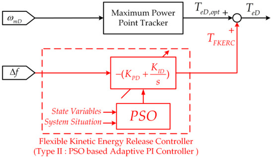 In the design of Type I flexible kinetic energy release controller, the controller gains are designed based on a certain set of system parameters and operating conditions in order to have a good frequency response under that particular operating point. However, the dynamic frequency response may become unsatisfactory when there is a change in system parameters or operating conditions. In order to have a good frequency response when the system is subject to variations in system parameters or operating conditions, the gains of the Type I flexible kinetic energy release controller may be adapted in real-time using the Type II PSO controller, as shown in Figure 7.