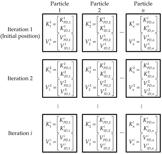 The procedures followed by the proposed flexible kinetic energy release controller using PSO to adjust the controller gains have been described in [30,31]. As shown in Figure 8, in each iteration i, particle n has positions K n i = [ K PD , n i K ID , n i ] T and velocities V n i = [ V PD , n i V ID , n i ] T . The positions and velocities are updated as follows: