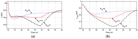 It is observed from Figure 5a that, after a brief period of frequency rise, the system frequency will drop again to a new low value when the integral controller output is gradually decreased to zero. The decay time t 2 is chosen to be 20 s, and the PI controller gains are K PD = 20 and K ID = 1.5 in Figure 5a. As shown from the response curves in Figure 5a, the delay time t 1 should be kept as small as possible in order to decrease the subsequent frequency drop. This is due to the fact that a longer delay time will cause a greater drop in the DFIG kinetic energy and a lower system frequency following the removal of the integral controller. In the present work, a delay time of 1 s is chosen for t 1 to cover the time required to detect the system frequency nadir.