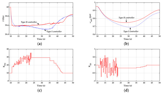 Figure 10. Comparison of dynamic response curves from the Type I and Type II controllers under change of system parameters T s m and T t 4 ( P g r i d = 45 MW, V w = 11 m/s, T s m = 0.375 s, T t 4 = 6.625 s). (a) Frequency, (b) DFIG speed, (c) PSO proportional gain, (d) PSO integral gain.