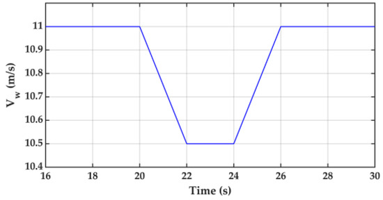 In order to assess the effectiveness of the Type II controller, the dynamic responses for different values of P grid under the combined effects of the SG time constant change, as described in Section 5.2.1, and the wind speed fluctuation, as shown in Figure 13, are depicted in Figure 14.