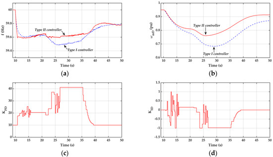 As shown in Figure 10c,d, the Type II controller was started when the frequency was lower than 59.6 Hz and higher gains for K PD and K ID from the Type II controller forced the DFIG to deliver more electrical power to the system. With the increase of the electrical power output from the DFIG, the system frequency was improved. In order to return to the MPPT operation mode, when the system frequency exceeded 59.65 Hz, the PSO gains were gradually decayed to the initial values ( K PD = 10, K ID = 0).
