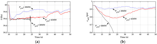 It is observed from the frequency response curves in Figure 10a, for the case of T sm = 0.375 s and T t 4 = 6.625 s, that the system frequency nadir is lower than the threshold of 59.6 Hz when a Type I controller with the same controller gains of K PD = 20, K ID = 1.1, and deficit power P grid = 45 MW as those used in Figure 9 was employed. Recall that the Type I controller with the gains K PD = 20 and K ID = 1.1 gave a satisfactory frequency response for the system with the original parameters ( T sm = 0.3 s and T t 4 = 5.3 s), as shown in Figure 9a. Therefore, it is concluded that the frequency response from a Type I controller is sensitive to system parameter variations.
