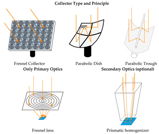 Typically, two optical components are used: “Primary Optics” (PO), whose task it is to focus the direct solar irradiance (DNI) and “Secondary Optics” (SO), which is used to distribute the radiation homogeneously on the CPV cell. An overview can be seen in Figure 2.
