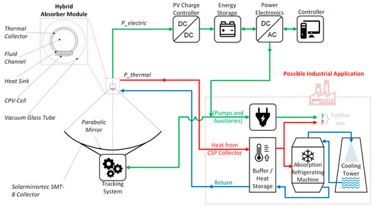 Schematics of solar cooling as a possible industrial application of a CPV-T system involving a parabolic trough collector and CPV-cells.