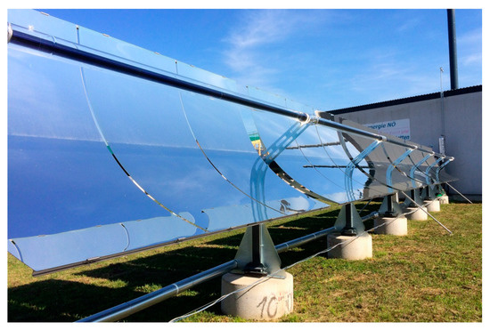 The idea of this project was to retrofit a commercially available, industrial parabolic trough collector, originally designed for solar thermal heat generation for district heating with a CPV-cell array. The basis for this retrofit-project is the model SMT-8 parabolic trough collector from the company IMK Solarmirrortec located in Seitenstetten in Austria, which relevant specifications are shown in Table 2. A picture of the collector is shown in Figure 4.