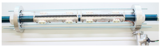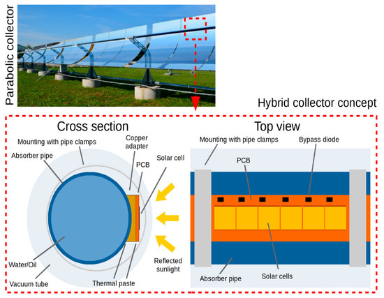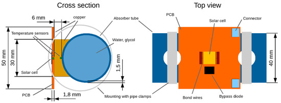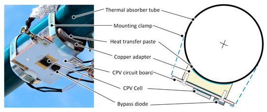 In order to test the basic functionality and for reasons of simplicity only a single solar cell is used instead of a solar cell array in the line focus (as shown in Figure 5). However, this should be sufficient to show the basic functionality and to obtain first solar cell efficiencies. A schematic design of the hybrid absorber can be seen in Figure 15. The multi-junction cell (triple-junction cell by the Spanish company Isofoton, up to 37% efficiency, up to 900 suns, 10 × 10 mm²) is soldered to a white coated printed circuit board (PCB) consisting of a copper core (DBC) (which also serves as the positive contact), the contact to the negative electrical connection was realized by bonding wires. The PCB is attached to the absorber tube via a copper adapter (compare Section 2.4).