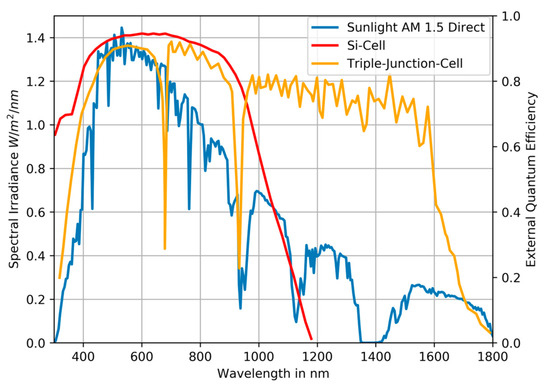 In multi-junction cells, several photo-active layers are stacked on top of each other, each layer responding to a different frequency band of the sunlight’s spectrum. This results in approximately twice the efficiency of silicon-based cells (e.g., 42% versus 22%) [6,30]. Figure 6 shows the spectrum of the sunlight (AM 1.5), the external quantum efficiency (EQE, the spectrum used by the solar cells) of a silicon-based cell and of a multi-junction cell (in this case with three layers (triple-junction cell)) in comparison. The increased efficiency of the multi-junction cell also has a downside: due to the stacking of the cells, the cells must be connected in series (results from the physical structure) [5]. If the incident light does not correspond to the solar spectrum (AM 1.5) and, for example, the spectrum for one layer is not available, this inevitably limits the other working cells. This means that the weakest cell is the bottleneck in a multi-junction cell stack. So, care must be taken to ensure that no parts of the sunlight spectrum are lost before they reach the solar cell (e.g., through limited reflectivity of mirrors or transmissivity of glass tubes/other optical components).