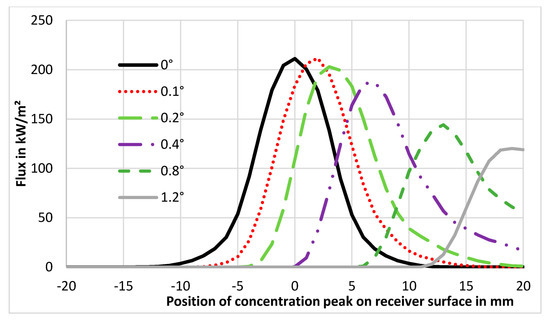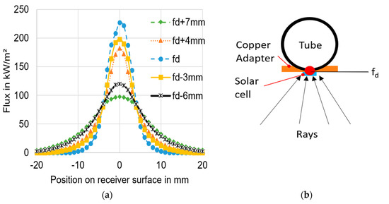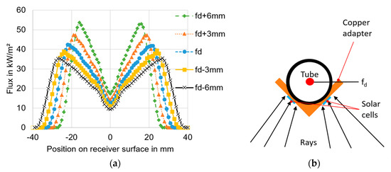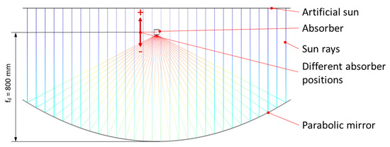 In Figure 8 the setup of the ray tracing simulation of the parabolic trough is depicted. An artificial sun sends its rays to the parabolic mirror, which redirects them to the focal point of the mirror. The ideal, theoretical focal distance of the simulated mirror (of ideal parabolic shape) is fd = 800 mm. Several simulations were performed while varying the receiver’s distance from the focal point (i.e., distance from the mirror) indicated with “+” and “−“ in the subsequent figure to visualize the influence of changes in receiver position (distance of the CPV cell from the theoretical geometric focal point fd).