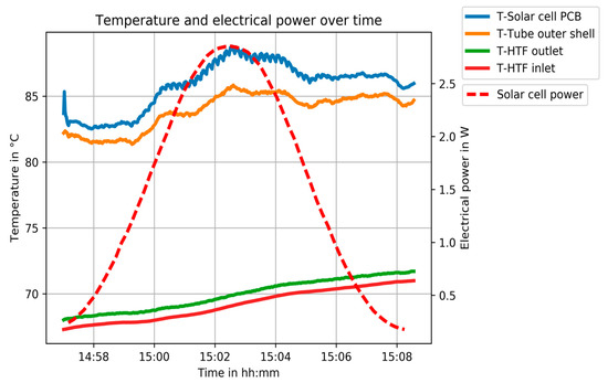 The maximum electrical power of the 10 × 10 mm2 Isofoton solar cell reached 2.85 W. The HTF had 70 °C at that time, while a temperature of 89 °C was measured on the backside of the cell. This results in a temperature difference of approximately 19 K between cell and average HTF. It should be noted that the heating process has not completely settled to a stationary state due to the short duration.