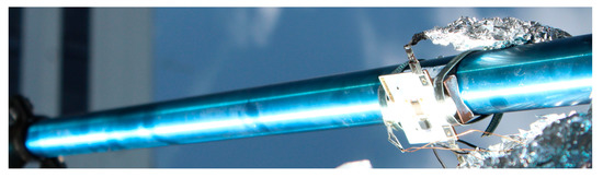 In this test, the basic functionality of the hybrid absorber was tested, and it was analyzed how the solar cell behaves at different positions of the line focus. The measurements took place on 12 August 2019, in Graz, Austria, under perfect weather conditions (clear sky). The global radiation was 699 W/m² and the ambient air temperature was 31 °C. The water glycol mixture used as heat transfer fluid (HTF) in the absorber tube, had a flow rate of 12 L/min. The distance between the absorber tube and the parabolic mirror was adjusted in such a way that the focal point is approximately on the center of the solar cells (adjusted based on optical estimation, compare Section 2.2). The parabolic mirror was aligned, so that the line focus moves over the solar cell due to the movement of the sun. The automatic tracking system of the SMT-8 was switched off during the measurement to eliminate this possible error source and rely solely on the movement of the sun. Figure 17 shows the measured temperature curves and the electrical power output of the solar cell. It can be seen that the cell power increases (line focus moves towards the cell center), reaches a peak at 15:02:30 (line focus exactly on the cell center) and then decreases again (line focus moves away from the cell center). Accordingly, the temperatures at the solar cell also rises or falls. Figure 18 shows the line focus at the maximum power output of the solar cell.