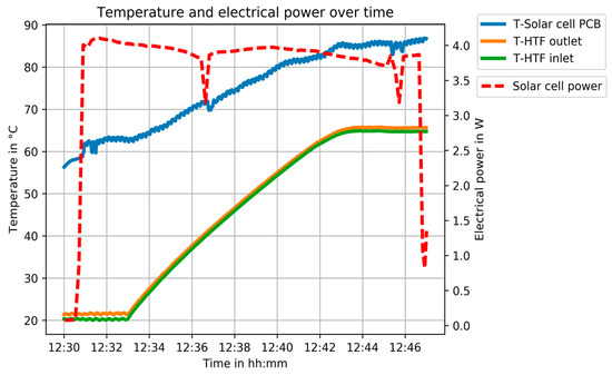 The maximum electrical power of the 10 × 10 mm2 solar cell reaches 4.1 W (see Figure 20). The measurement started with a HTF temperature of 20 °C, followed by a transition to 65 °C, which was kept constant afterwards. It can be seen that the temperature differences between HTF (T-HTF outlet) and solar cell (T-Solar cell PCB) are larger (in comparison to the last test in Section 3.2), due to the more precise alignment of the line focus and the higher irradiance.