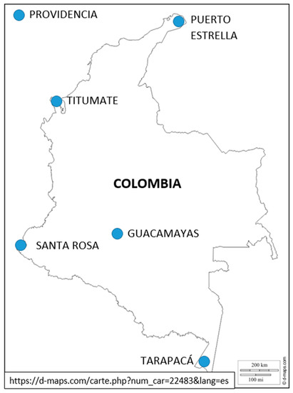 The locations selected for this study are located within the NIZ. However, they have very different climatic conditions and renewable resources. The 6 selected locations have an altitude of less than 300 metres. The first three locations are found in tropical forests, Guacamayas is in the tropical savanna, Providencia has a dry tropical climate, and Puerto Estrella has an arid desert climate [44,45]. Figure 1 shows the map locations, and the Table 1 shows the geographic and climate information of the selected locations:
