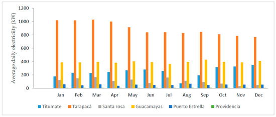 The annual profiles of the daily demand for the 6 locations were prepared using data provided by the national monitoring center of the Institute of Planning and Promotion of Energetic Solutions (IPSE) in the Non Interconnected Zones [50]. Figure 3 and Figure 4 show the average daily demand curves for one year, as well as the daily demand profile for the 6 locations. It is important to note that most of the energy demand is produced at night, except in the case of Providencia, where consumption is similar during all hours of the day. In some of the simulations, a modified demand curve was used applying demand-side management [51,52].