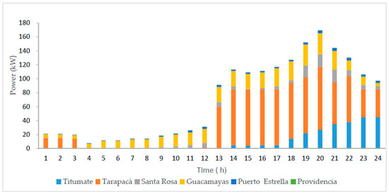 Most of the energy demand of these communities corresponds to lighting, small appliances and refrigeration equipment. The demand for energy during daylight hours is low because the main activities in these communities are agriculture and fishing, which naturally take place outside of the home. For the preparation of meals, mainly firewood is used, and in some cases liquid propane gas (LPG) [47]. Table 3 shows the current situation of energy demand and generation systems of the 6 locations. In the case of Providencia, the average consumption for an isolated house was selected, and in the case of Puerto Estrella, the consumption for 20 houses was considered, and wind generation was not considered because the wind turbines currently installed were not in service [48]. Figure 2 shows 2 of the systems considered in this work; they are currently operating as hybrid systems in Titumate and Puerto Estrella.