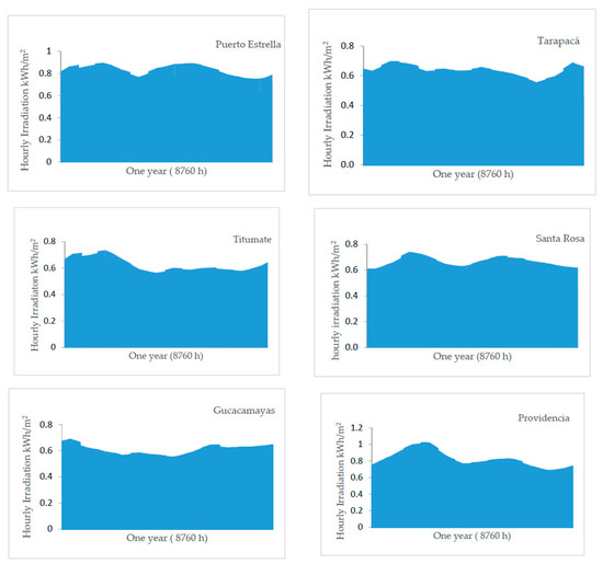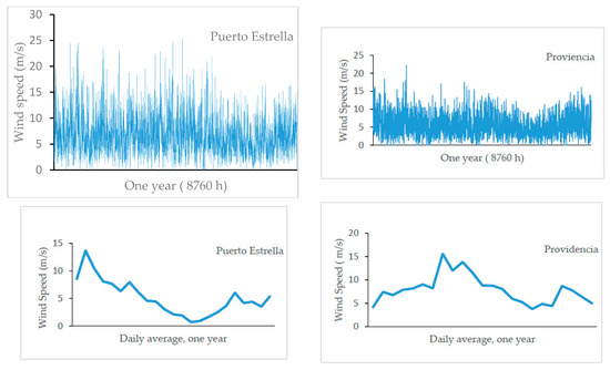 The 6 locations selected for this study have average daily irradiation values of 4.5 kWh/m2/day, exceeding the global average value [53]. On the other hand, only in Puerto Estrella and Providencia is generation by wind resource viable, with both having an average wind speed greater than 8 m/s [54]. Figure 5 and Figure 6 show the hourly irradiation and wind speeds over a whole year. Puerto Estrella is located in an area with the highest average wind speeds in South America, making wind power generation viable [55].