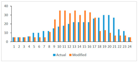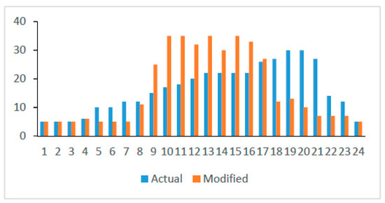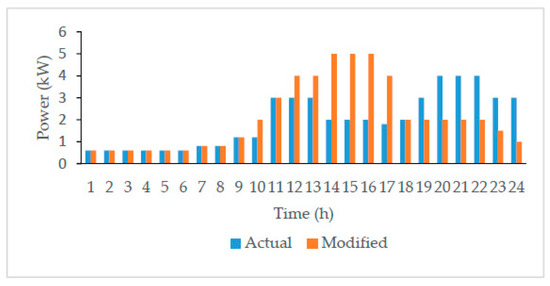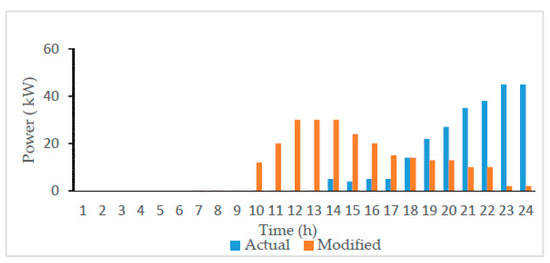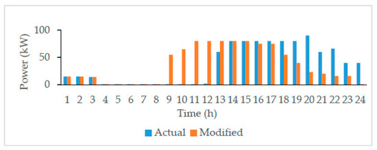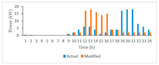 The most adequate isolated microgrid for the energy demand of the population of Titumate corresponded to a combination of PV-diesel-battery. Figure 7 shows the daily load curve for this location considering the current load and the modified load with demand-side management. The modified load was obtained by changing the timing of some of the consumptions, to coincide with hours of high irradiation. In many cases it is difficult to change the hours of electricity consumption, since it implies a change in the population’s habits. However, in this work we want to see the implication of this change in the cost of the optimal system.