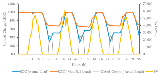 Figure 8 shows the results of the optimization for the first 4 days of the year in the town of Titumate considering the cases of the current load and of the modified load with the best NPCs. It is observed how the SOC of the battery bank increases when using the modified load profile, remaining practically above 60%. This can extend the useful life of the batteries and simultaneously reduce the operation time of the diesel generator.