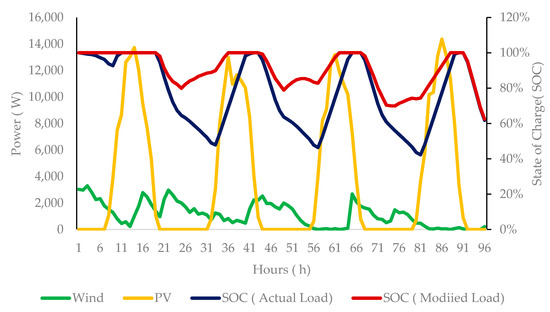 Figure 13 shows the simulation for the first 4 days of the year for the town of Puerto Estrella. With the modified load, the output power of the wind turbine is better used in hours of low radiation, which leads to an increase in the SOC of the battery bank.