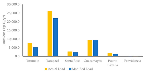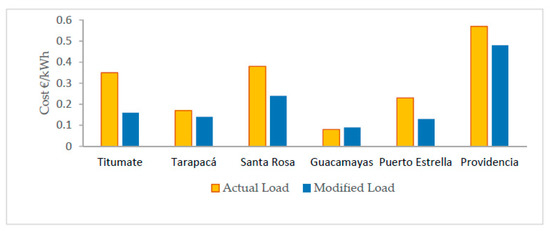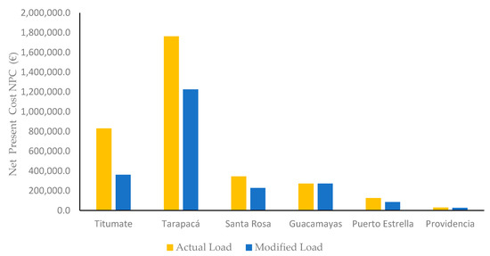 Figure 15 shows the different energy costs obtained with the current and modified load profiles for the 6 microgrids using lead-acid batteries and the load following strategy. A lower energy price is observed in 5 of the locations using a modified load profile. Figure 16 shows the NPCs of the 6 locations for optimization using lithium batteries and with the load following strategy, observing a decrease in costs in 5 of the 6 microgrids using modified load profiles. In three locations (Titumate, Santa Rosa and Puerto Estrella) the cost reduction is around 50% with the modified load profile.