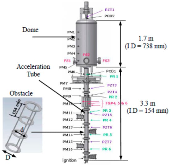 IRSN in France performed the hydrogen flame acceleration test using the ENACCEF facility with a hydrogen concentration of 13% and an obstacle blockage ratio of 0.63 (Table 1) [,,]. The ENACCEF is a vertical facility of 5 m high, as shown in Figure 1. It is divided into two parts of the acceleration tube and the dome region. Nine annular obstacles are continually installed in the acceleration tube. The first obstacle is located at 0.876 m from the bottom of the acceleration tube. The blockage ratio of the obstacle is defined as Equation (23). In the equation, D and d are the inner diameters of the acceleration tube and obstacle, respectively. The hydrogen–air mixture was ignited at the bottom region by an electric spark device, after setting the initial hydrogen concentrations as shown in Table 1. Then, the hydrogen flame propagated upward along the acceleration tube in the test facility. They measured the flame front time of arrival (TOA) at 16 locations, using photomultiplier tubes, and the pressure at 9 locations to observe the flame acceleration phenomenon, using 9 high-speed pressure transducers, in which 7 transducers were a Chimie metal type and others were a Kistler type. The pressure data, as shown in Figure 2b, was measured by the Kistler pressure transducer.