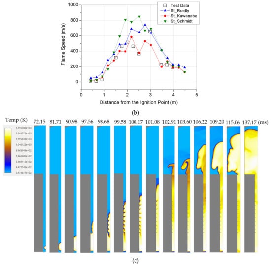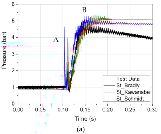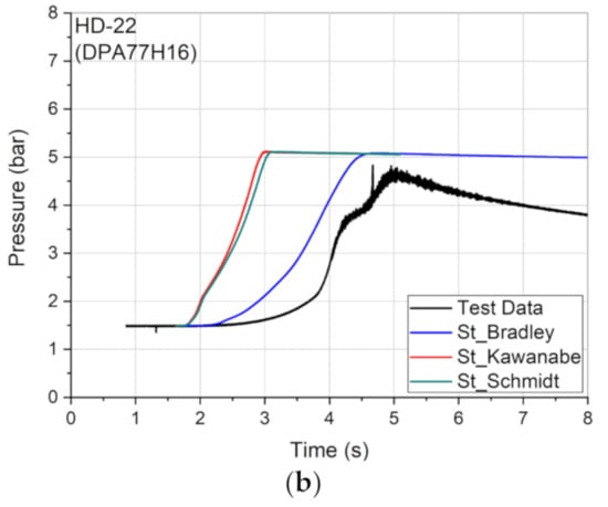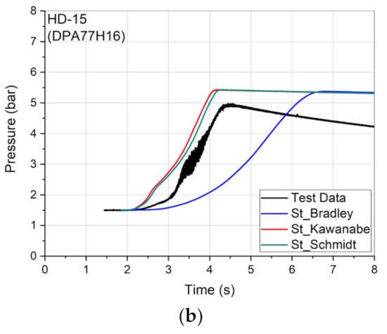 The flame propagation speed is predicted by Cg (Equation (16)), which is proportional to the gas expansion ratio (σ) and the turbulent flame speed model (St). In Equation (16), α and β are correlation constants obtained from numerical experiments with the values equal to 0.243 and 0.375, respectively. We chose three turbulent flame models proposed by Bradly (Equation (17)), Kawanabe (Equation (18)), and Schmidt (Equation (19)) in this validation, on the basis of the previous COM3D calculation results [,,]. In three models (Equations (17)–(19)), SL represents the laminar flame speed dependent on the temperature, pressure, and steam concentration, and the turbulent intensity (u’) can be obtained by use of the calculated turbulent kinetic energy from Equations (8) and (9).