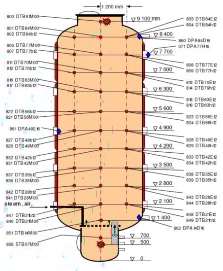 Becker Technologies in Germany performed the hydrogen deflagration test at a condition of the hydrogen concentration of approximately 10%, by varying the steam concentration from 0% to 25% in the THAI facility []. The THAI facility is a cylindrical stainless steel vessel of 9.2 m height and 3.2 m diameter, with a total volume of 60 m3, as shown in Figure 3. The vessel outer wall is completely enveloped by a 120 mm rockwool thermal insulation. An obstacle geometry to accelerate the hydrogen flame was not installed, but a structure to support thermocouples existed in the vessel. An air-driven axial fan installed in the lower plenum of the vessel was used to set homogenization of the vessel gas atmosphere, prior to the start of the hydrogen combustion. To monitor the gas temperature change during hydrogen deflagration, 43 thermocouples (TCs) with outer diameter 0.25 mm were installed at 13 different elevations in the vessel. The gas temperatures were measured at the rate of 1000 Hz. The hydrogen–air mixture was ignited at the bottom region by an electric spark device, after setting the initial hydrogen concentrations, as shown in Table 2. Then, the hydrogen flame propagated upward along the acceleration tube in the test facility.