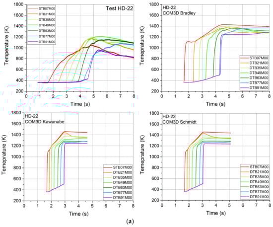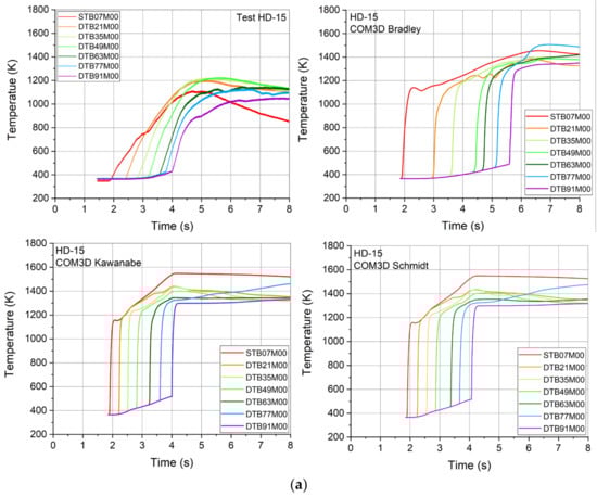 The comparison of temperatures and pressure between the analysis results and test data are shown in Figure 4 and Figure 5. The COM3D results with the KYLCOM+ model using the turbulent flame speed models of Bradly, Kawanabe, and Schmidt showed that the pressure decrease according to the steam concentration increase from 0% to 25% were accurately predicted from approximately 5.5 bar to 5.0 bar, with an error range of approximately 10%, compared to the test data, as shown in Figure 4b and Figure 5b. However, the time needed for the flame propagation along the centerline from 0.7 m to 9.1 m in the test HD-22 decreased to approximately 75% of the calculated time for the test HD-15. These results were different from the measured data in the tests HD-15 and HD-22. This meant that the flame propagation becomes faster as the steam concentration increases from 0% to 25%. To find the exact reason for this problem, we investigated the laminar flame speed model at the steam presence implemented in the COM3D version 4.10 [,]. The time needed for the flame propagation using the Bradley model was longer than those of other models, as shown in Figure 4a and Figure 5a. This result might be explained by the fact that the hydrogen flame first propagated along the right side wall and moved upward and then turned its direction to the central region in the vessel, as shown in Figure 6a. The temperature contours on the center plane of the vessel by the Kawanabe model showed that the flame mainly propagated upward along the central plane in the vessel (Figure 6b). The flame propagation from the bottom to the top in the vessel by the Schmidt model was similar to that of the Kawanabe model (Figure 4a). Through the hydrogen combustion analyses for the tests of HD-15 and HD-22, we found that the calculated peak pressures accurately predicted the measured pressures, with an error range of approximately ±10%, even though the times needed for the flame propagations were not accurately predicted. The calculated pressure overestimated the measured pressure after completing the hydrogen combustion, such as the analysis result for the ENACCEF test, because the calculation results did not simulate the heat loss along the vessel wall owing to the steam condensation and the radiative heat transfer.