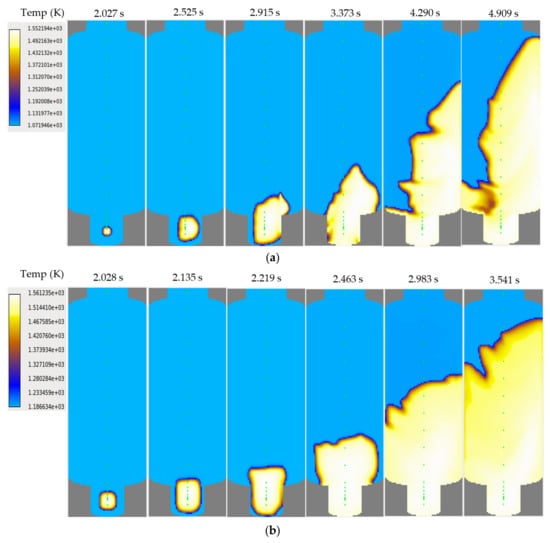 Temperature contours on the center plane for the Test HD-15 by COM3D. (a) Calculation by the Bradley model; and (b) Calculation by the Kawanabe model.