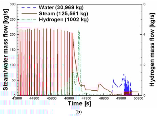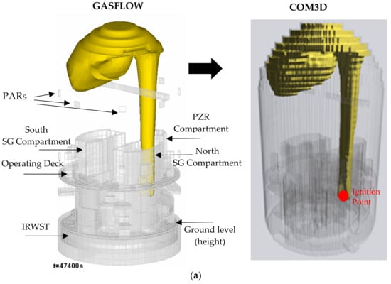 There are two currently operational plants of APR1400 and four plants under construction, in Korea. The dimension of the APR1400 containment was changed to include the in-containment refueling water storage tank (IRWST) in the containment, which was located outside the containment of the Optimized Power Reactor 1000 MWe (OPR1000). Thus, the diameter and height of the APR1400 containment with a cylindrical dome geometry were increased to 45.72 m and 69.69 m from 43.89 m and 65.83 m in the OPR1000, respectively. The containment height was defined from the ground level to the top of the cylindrical dome. As a result of the geometrical change, the air-free volume in the APR1400 containment was also increased to approximately 88,631 m3 from 77,021 m3 of the OPR1000. The top and bottom of the SG compartments in the APR1400 and OPR1000 were opened to the air-free space in the containments, as shown in Figure 7a. In addition, the APR1400 had a safety depressurization system (SDS), which discharges the reactor coolant from the primary system to the IRWST, to reduce the primary system pressure during a high pressure accident like that of the SBO accident. A 3-way valve located at the bottom of the pressurizer (PZR) in the SDS changed the flow path of the discharge of the reactor coolant from the IRWST to the north SG compartment, when the severe accident occurred in the reactor pressure vessel (RPV) during the SBO accident, to prevent the hydrogen release to the IRWST, according to the severe accident management guideline (SMAG) []. In this study, the release location of the hydrogen in the SG compartment was assumed, as the elevation was similar to the bottom of the PZR. The released hydrogen gas into the containment could be removed by the thirty passive auto-catalytic recombiners (PARs) installed in the containment, though electrical power was not available during the SBO accident. The design pressure of the inner wall in the APR1400 containment was approximately 513 kPa in absolute pressure [].