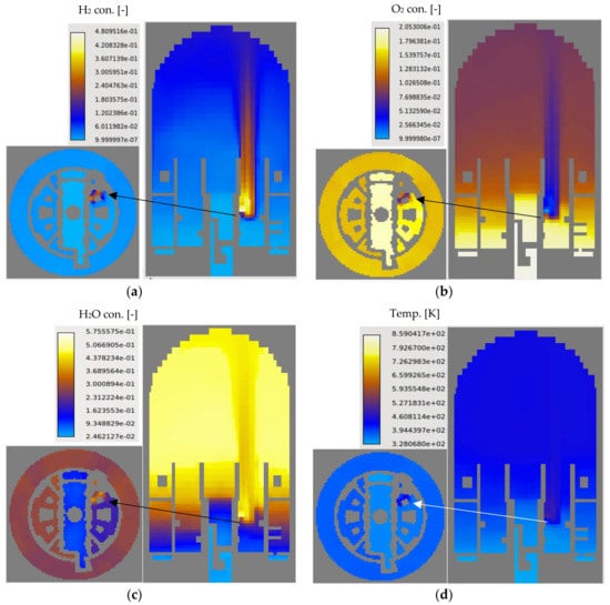 To model a turbulence flow during the hydrogen combustion, the standard k-ε model (Equations (8)–(12)) implemented in the COM3D code is used []; here, Cμ = 0.09, C1 = 1.44, C2 = 1.92, Ck = 1.0, and Cε = 1.3. The standard k-ε model might be used as a practical tool to calculate a turbulent flow in the hydrogen combustion, when considering its accuracy and calculation time [,].