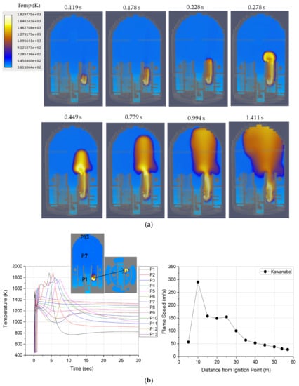 The COM3D calculation for the hydrogen flame acceleration during severe accidents in the APR1400 containment was performed for approximately 30 s, using the transferred GAFLOW results and refined grid model, on the basis of the proposed analysis methodology (Table 3). In particular, to induce a strong flame acceleration over a long distance, the ignition point was assumed at around the hydrogen release location in the north SG compartment (Figure 7a) []. The ignition process was modeled by the use of a hot spot spherical region, with a radius of 0.5 m, where the hydrogen–air chemical reaction took place with the laminar flame speed. The COM3D results using the Kawanabe model showed that the hydrogen flame was propagated to approximately 57 m along the vertical direction, 1.0 s after the start of the ignition, and turned to the left where the hydrogen was located, as shown in Figure 9a. The calculated flame speeds between P1 to P3 increased to approximately 300 m/s, in the SG compartment and decreased to about 30 m/s at the upper region of the containment (Figure 9b). This flame speed variation along the vertical direction might have resulted from the initial conditions of the hydrogen, oxygen, and steam concentrations, and the turbulent kinetic energy (Figure 8). The flame arrival time needed for calculating the flame speed was defined as the instant when the gas temperature increased to approximately 700 K at the locations of P1 to P13. The calculated flame speed of approximately 300 m/s around the hydrogen release point in the SG compartment looked like a lower speed, when considering the hydrogen concentration of approximately 25% to 35%, as shown in Figure 8a. This result might be explained by the fact that the oxygen with approximately 4% to 7% located around the hydrogen release point limits the total hydrogen mass consumed in the chemical reaction of the hydrogen and air, as in Equation (22). Thus, the calculated combustion energy might be similar to that of the hydrogen concentration of approximately 8% to 14%.