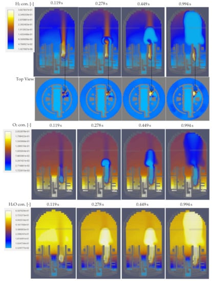 Calculated concentrations of hydrogen, oxygen, and steam, according to time variation.