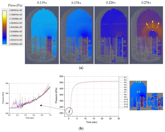In addition, the steam presence with approximately 35% to 45%, hinders the hydrogen–air chemical reaction around the hydrogen release point. As a result of the oxygen starvation phenomenon, hydrogen with approximately 15% to 20% still remains or the hydrogen moves downward to the lower region after the flame front arrives at the upper location of the top of the SG compartment (Figure 10). According to the hydrogen combustion limited by the oxygen starvation in the SG compartment, the increased pressures owing to the weak flame acceleration during the severe accident initiated by the SBO accident were approximately 260 kPa from the initial pressure of approximately 250 kPa, as shown in Figure 11a. The low pressure increase might have resulted from the low flame speed along the vertical hydrogen column. Another reason might be explained by the fact that the pressure wave generated at the combusted region passed through the open spaces in the upper region of the large containment, as shown in Figure 11b. If the COM3D could simulate the steam condensation along the containment wall, the peak pressure might decrease from approximately 510 kPa. Through the hydrogen combustion calculation, we found that the calculated peak pressure in the containment by the COM3D did not exceed the fracture pressure 1223 kPa in the absolute pressure, which was imposed on the inner wall of the APR1400 containment []. The fracture pressure was generally assumed to be approximately 2.38 times the design pressure of the containment [].