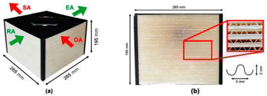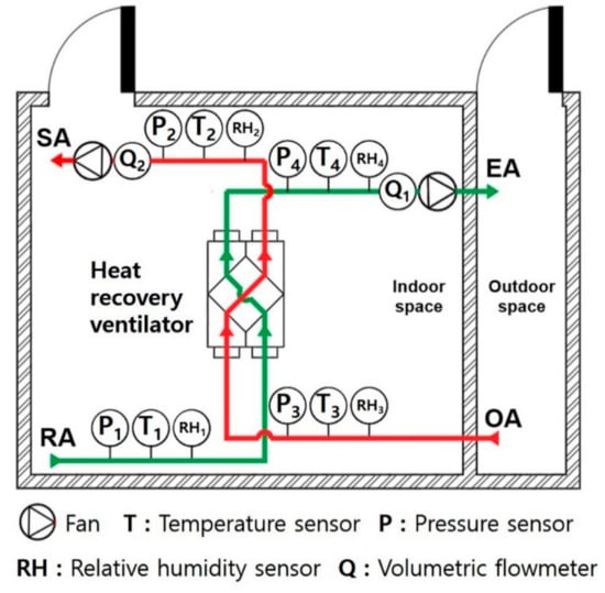 In the heat recovery ventilator, as shown in Figure 2, the heat exchanger element with a width of 265 mm, depth of 265 mm, and height of 195 mm was made of a heat recovery paper. The heat recovery paper restricts air transfer between the two channels while allowing heat and moisture exchange between them. The temperature, humidity, and pressure of the OA, SA, RA, and EA were measured using an resistance temperature detector (RTD), hygrometer, and digital pressure transducer, respectively. The pressure difference across the heat exchanger element was measured using a digital differential pressure transducer. In addition, the airflow rate was measured using a vortex flowmeter. Table 1 shows the specifications and accuracies of all the measuring devices.