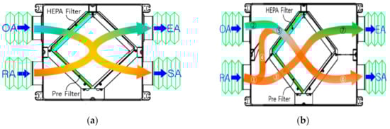 Figure 3 shows two ventilation methods employed in the heat recovery ventilator. In the conventional method, as shown in Figure 3a, the RA passes through the heat exchanger element, discharging as the EA, whereas the cold OA is supplied to the indoors as the SA after passing through the heat exchanger element. In summer, the cold RA exchanges heat with the warm OA passing through the same flow path; the air is supplied to the indoor and subsequently discharged to the outdoor. In the mixed ventilation method, as shown in Figure 3b, the OA is mixed with a portion of the RA, which leads to an increase in the temperature. The temperature of the mixed OA is then increased to an above-zero value through heat exchange with the EA, thereby reducing the amount of condensation.